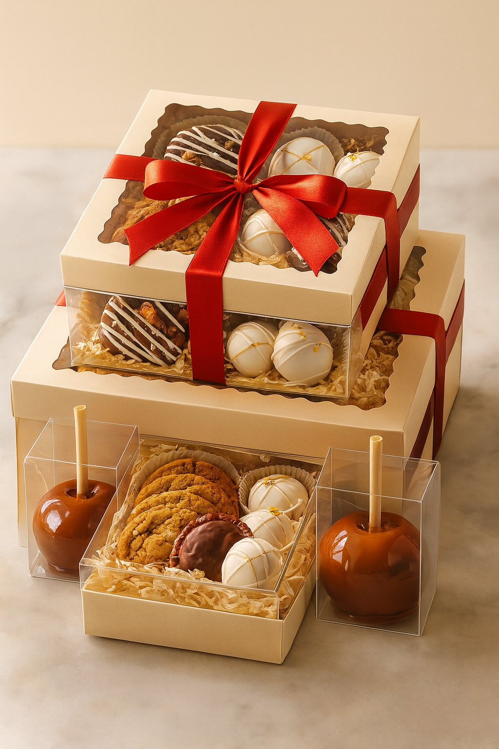 The Executive Collection is our premier holiday gift box — a luxury assortment of 50 handmade treats paired with three gourmet caramel apples.